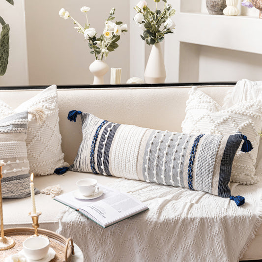 Handmade Coastal Blue Boho Woven Lumbar Pillow Cover 14x36